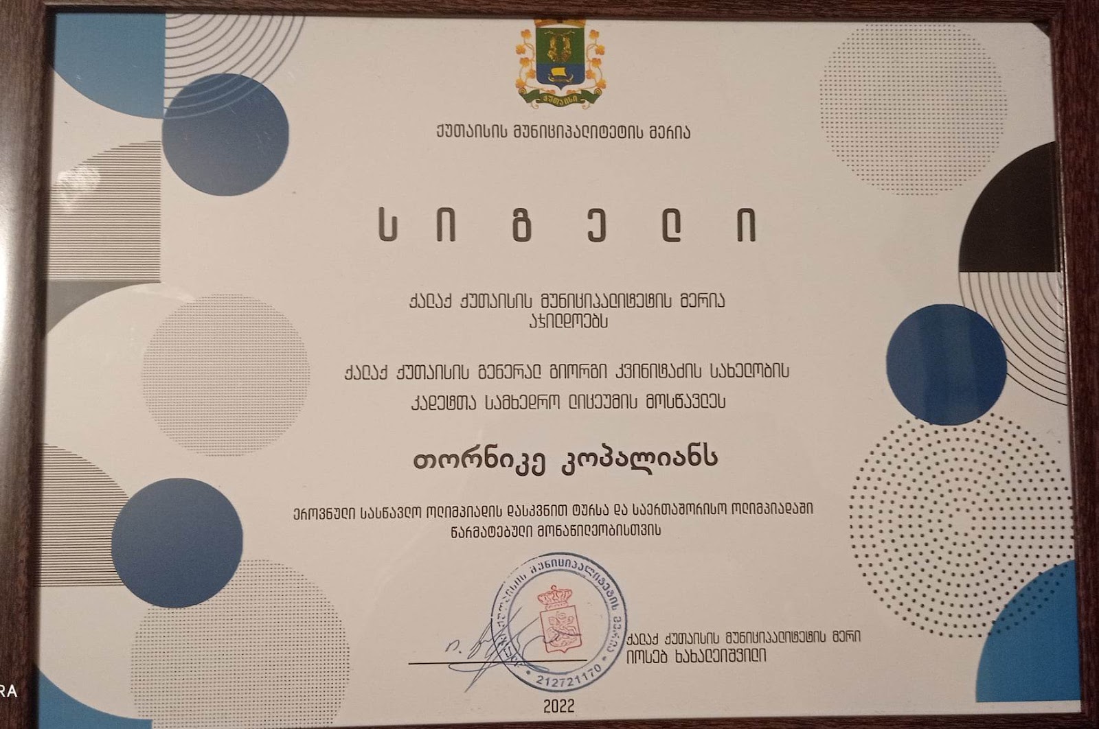 სახელმწიფოსგან დაჯილდოვდა დიპლომითა და 1000 ლარიანი სასაჩუქრე ბარათით. იგი ასევე დიპლომითა და ფულადი ჯილდოთი დაასაჩუქრა ქ.ქუთაისის მუნიციპალიტეტის მერმა.